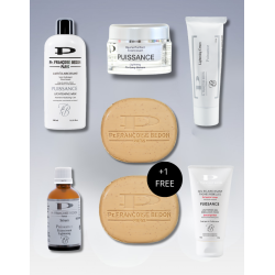 Pack complet de soins éclaircissants visage et corps. Corrige les taches brunes, unifie le teint et améliore l’éclat de la peau. Inclut l’ensemble de la gamme Puissance avec un deuxième savon offert.
