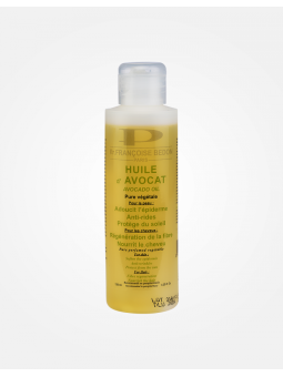 Huile végétale formulée à base d’avocat, destinée aux soins de la peau et des cheveux dans le cadre d’une routine cosmétique.