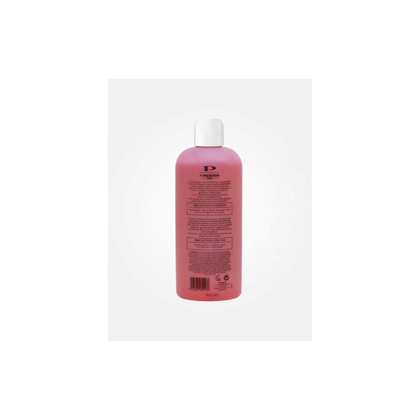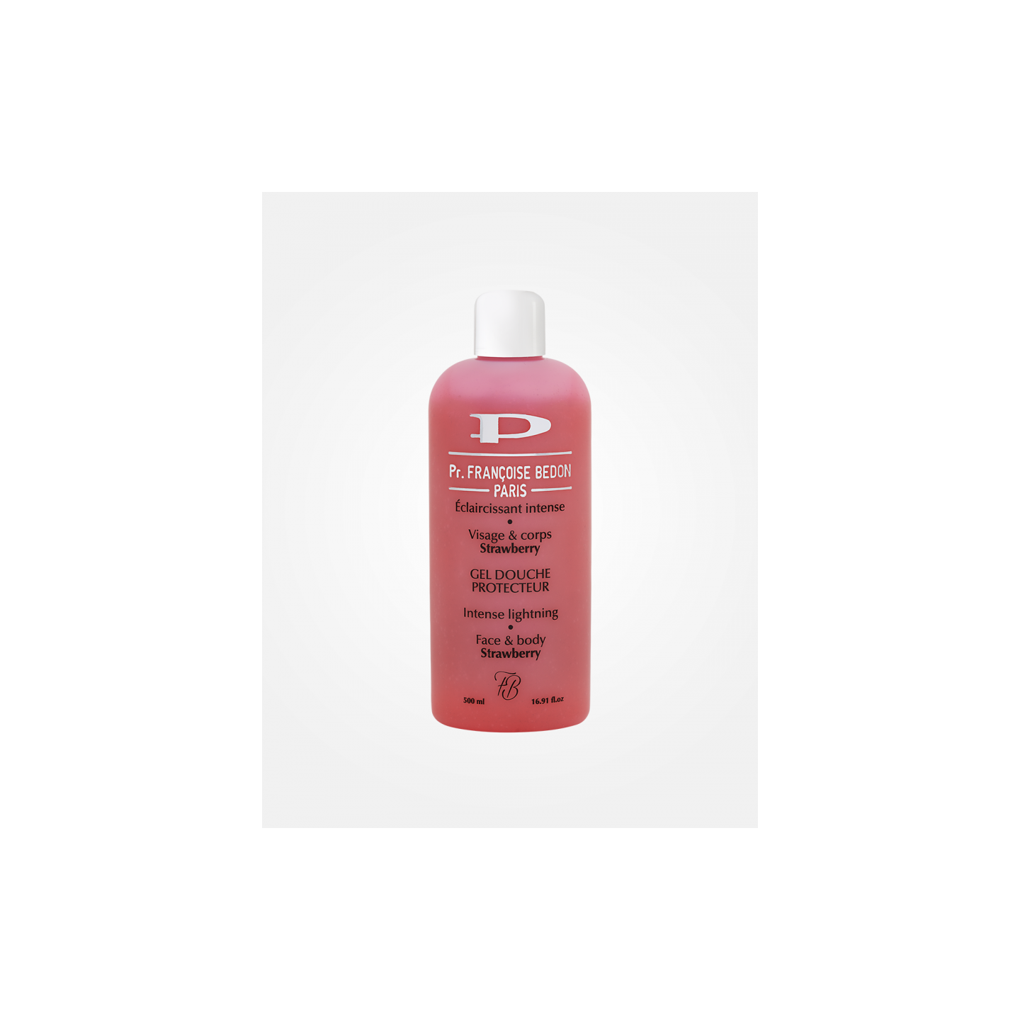 Gel douche protecteur pour le visage et le corps, enrichi en extrait de fraise, formulé pour nettoyer la peau en douceur tout en contribuant à un aspect plus uniforme.